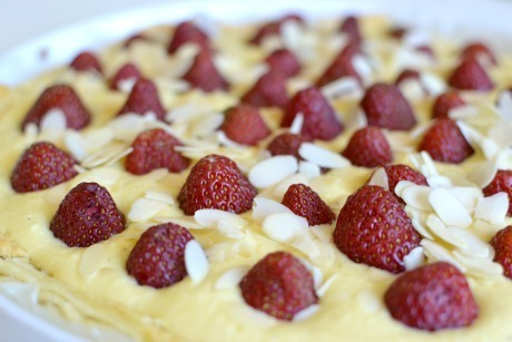 Předpečený a vychladnutý základ na koláč pomažte rozvařenou rebarborou. Nalijte krém, uhlaďte a na celou plochu zatlačte úhledně jahody. Posypte mandlovými plátky.