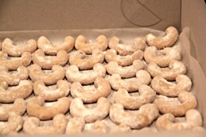Těsto necháme ustát v chladnu do druhého dne, poté tvarujeme. Aby se těsto nezahřívalo, pracujeme s ním po částech. Pečeme 10 až 12 minut při teplotě 180 až 200°C. Hned po vytažení ještě horké obalujeme ve směsi moučkového cukru a vanilkového cukru a rovnou ukládáme do papírových krabic, skladujeme v chladnu.
