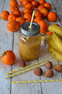 Banán nalámejte na kousky, mandarinky oloupejte, liči také. Všechny suroviny vložte do mixéru nebo smoothie makeru. Přidejte vodu a lžičku chia semínek.