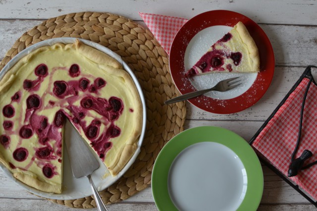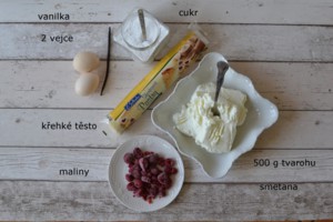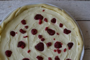Připravenou tvarohovou náplň nalijte do formy, na těsto. Uhlaďte povrch a do náplně vmáčkněte ovoce. V našem případě to byly mražené maliny, které jsme před použitím nerozmrazovali.