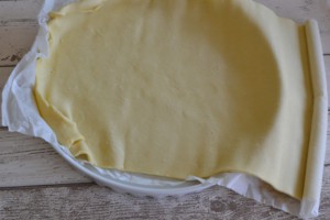 Křehké těsto rozbalte a připravte do kulaté formy o průměru cca 28 cm. Těsto je v balení připravené na pečícím papíru a formu bude určitě přesahovat.