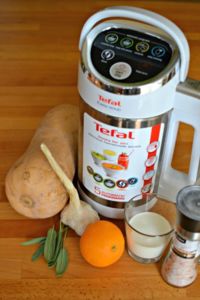 Dýni i česnek dejte do Tefal Easy soup. Přidejte šťávu a dužinu z pomeranče, dva lístky šalvěje, kokosové mléko a ochuťte solí.