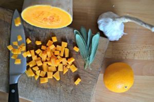 Máslovou dýni zbavte ostrým nožem slupky. Nakrájejte na malé kousky. Česnek nasekejte nadrobno.