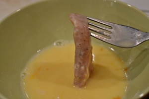 Z mouky přesuneme maso do misky s rozšlehaným a lehce osoleným, případně jinak ochuceným, vajíčkem. Opět obalíme tak, aby bylo vajíčko na celém mase.