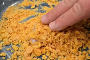 A poslední vrstva - cornflakes. Ty lehce rozdrtíme, stačí rukou. Tak, aby v misce byly větší i menší kousky. Přimačkáme na maso.