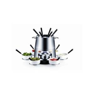 Výbornou sadu na fondue vyrábí Tescoma. Vynikající pro přípravu a stylové podávání masového, sýrového a čokoládového fondue, určeno až pro 6 osob. Dvě nádoby - nerezová pro masové a keramická pro sýrové a čokoládové fondue, 6 otočných keramických misek, 6 barevně rozlišených fondue vidliček a lžiček, nastavitelný plamen. Vyrobeno z prvotřídní nerezavějící oceli, odolné keramiky a kvalitního plastu.