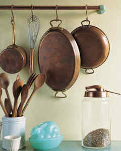 Kolem celé kuchyně můžete mít na zdi přišroubovanou tyčku, na kterou zavěsíte všechny potřebné kuchyňské pomůcky. Štětce, pánvičky, struhadla, formičky. Cokoliv používáte a chcete mít po ruce.