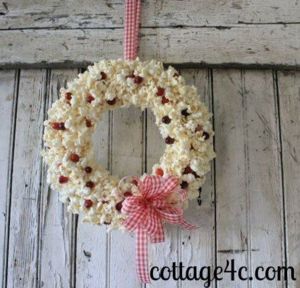 Vyrobit ho můžete několika způsoby. Nám se zalíbil nápad z webu Marthy Stewart. Jednotlivé kousky popcornu budete napichovat na jehlu a navlékat na nit. Výsledný řetěz omotáte kolem polystyrenového základu na věnec. Nakonec ozdobíte mašlí.