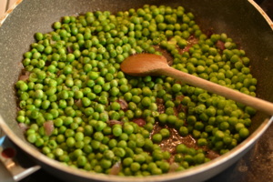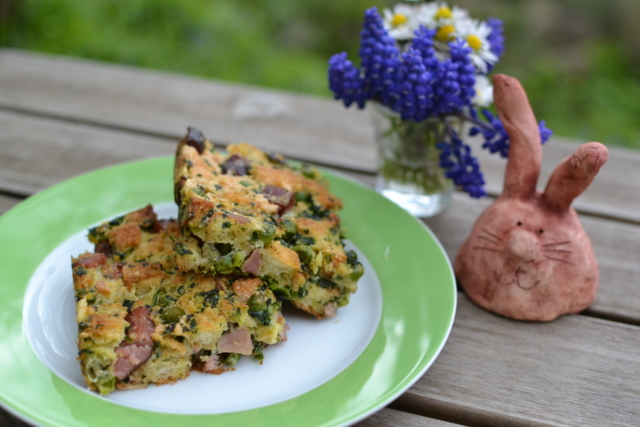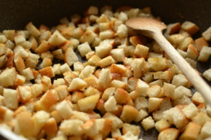 Pečivo použijeme ideálně staré aspoň dva dny. Nakrájíme na malé kostičky, které osmahneme dokřupava na másle. Dáme stranou. Oddělíme žloutky a bílky. Do žloutků přimícháme rozpuštěné máslo a smetanu, dochutíme solí a pepřem. Na másle osmahneme najemno nakrájenou cibulku, ke které přidáme hrášek a špenát, dochutíme solí a česnekem. Chvíli podusíme a necháme vychladnout.