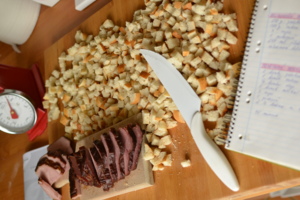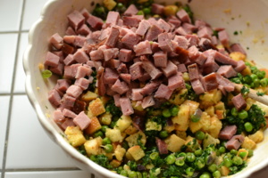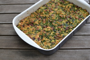 Z bílků ušleháme tuhý sníh. Do žloutkové směsi nasypeme křupavé kostičky pečiva. Promícháme. Přidáme maso nakrájené na kostičky, vychladnutou zeleninu a ještě můžeme dochutit solí a pepřem, případně muškátovým oříškem. Promícháme. Úplně nakonec jemně vmícháme sníh a přesuneme do zapékací mísy.