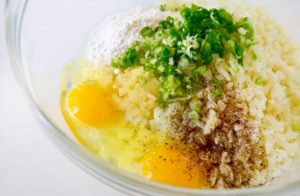Smíchejte květák, mouku, vejce, česnek, najemno nakrájenou zelenou jarní cibulku, sůl a pepř. Dobře promíchejte.