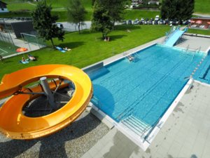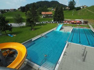Další den jsme se vydali na cestu z chaty na chatu a po našem horském putování, třeba na chatě Hoch Hädrich nebyla ani sprcha, jsme se těšili do bazénu. V Hittisau mají stejně jako v sedmi dalších vesnicích v Bregenzském lese krásný nerezový bazén, který je vyhříván na 24°C. Kromě malé, ne příliš rychlé skluzavky se ale mohou děti s rodiči vyblbnout na krásném tobogánu. Který je zase přesně na hranici snesitelnosti, jak ze strany rodičů, tak dětí. Prostě tak akorát.